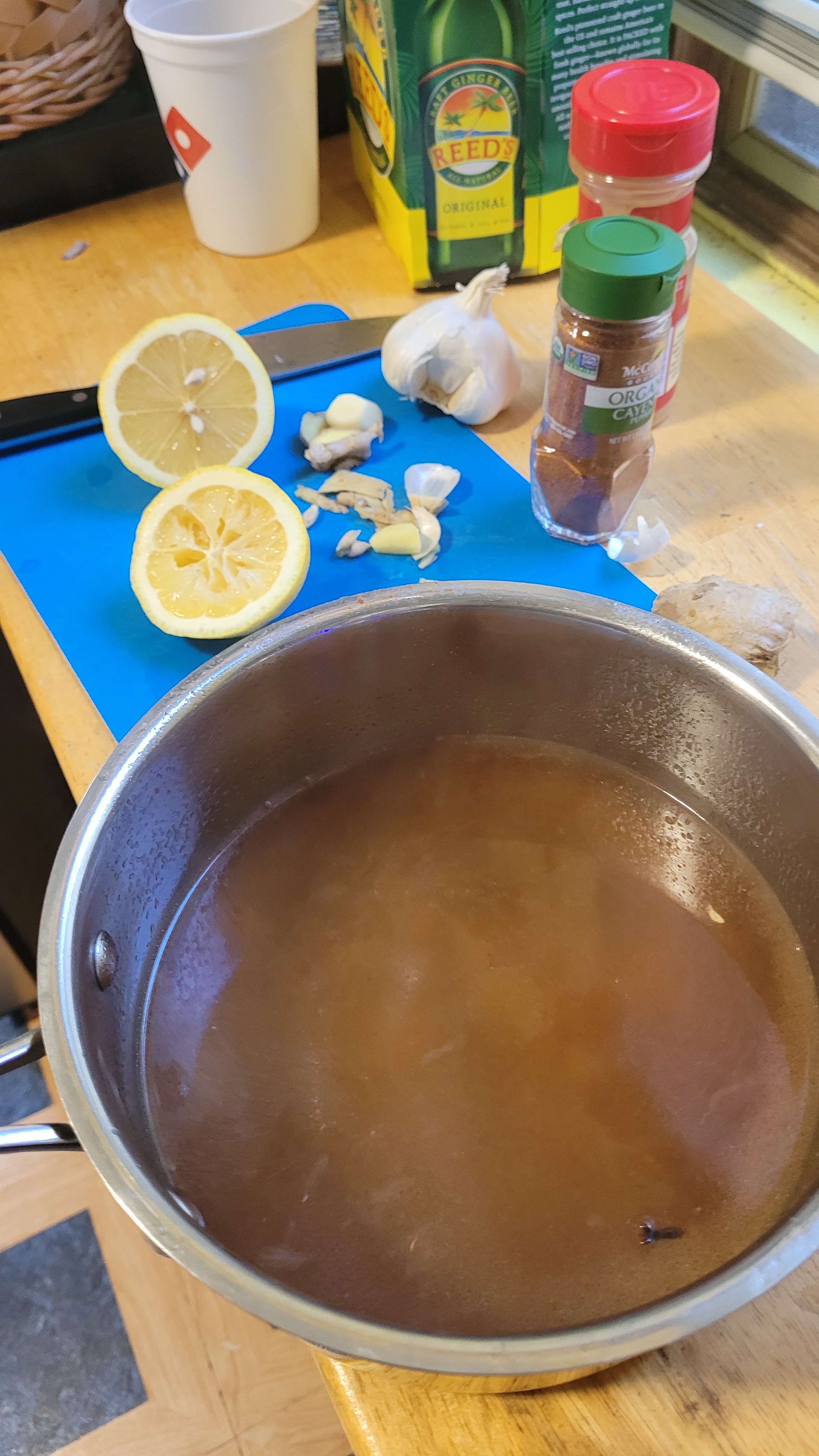 Reduce heat, add lemon slices and squeeze the juice of the two halves in. Add ginger, garlic, clove, brandy and honey. Let simmer on low for a bit stir occasionally. Stir clockwise with intentions of healing and care to all who partake.